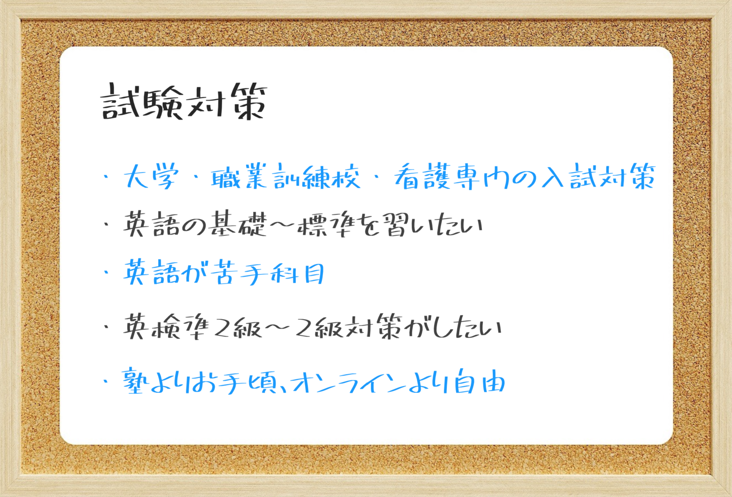 英語が苦手だった方や、基礎でつまずいた経験がある方へ。 このサービスでは、既存の教材やあなたが使っている問題集を一緒に解きながら、 つまずきやすいポイントを徹底的に分解して解説します。 ✅理解を深める質問がいつでもOK 小さな疑問もどんどん質問してください。あなたのペースで、着実に解決していきます。 ✅ 看護学校、職業訓練校、高卒認定試験の英語にも対応